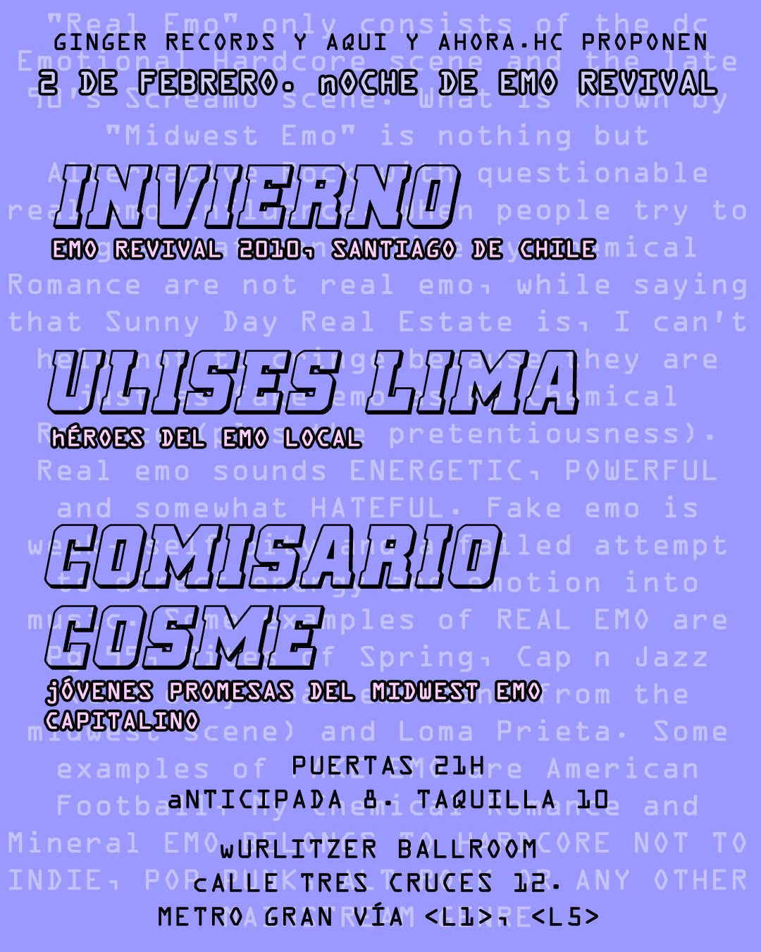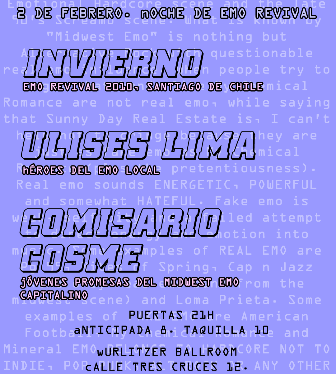 Invierno nos visitan desde Santiago de Chile el próximo día 2 de febrero. La figuras indiscutibles del emo revival de habla hispana estarán tocando en la Wurlitzer Ballroom el próximo lunes 2 de febrero con Ulises Lima (Emo héroes locales) y Comisario Cosme (jóvenes promesas locales del Midwest Emo). 8 anticipada, 10 taquilla. Nos vemos allí.