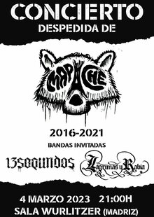Concierto de despedida de la banda madrileña de Punk Rock melódico Mapache. Tras cinco años de actividad, tres grabaciones y numerosos conciertos se despiden definitivamente de los escenarios. Estarán acompañados por dos invitados de lujo de la escena subterránea  punk rock madrileña: 13 Segundos y Lágrimas y Rabia.
